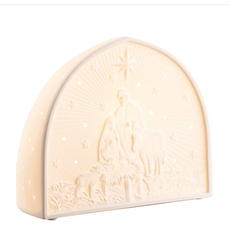 The Nativity Crib Luminaire has been exquisitely modelled and depicts the classic Nativity Scene. The back is delicately pierced and casts beautiful shadows when illuminated. The porcelain body emits a soft gentle glow highlighting all the details in this charming lamp.