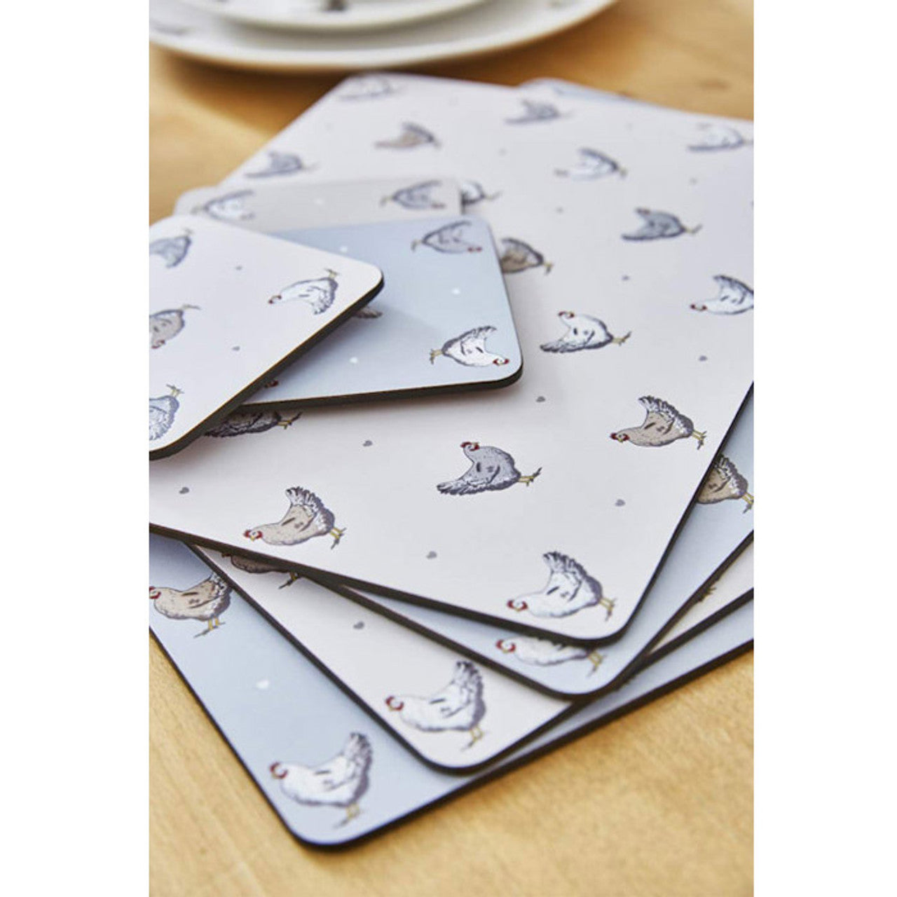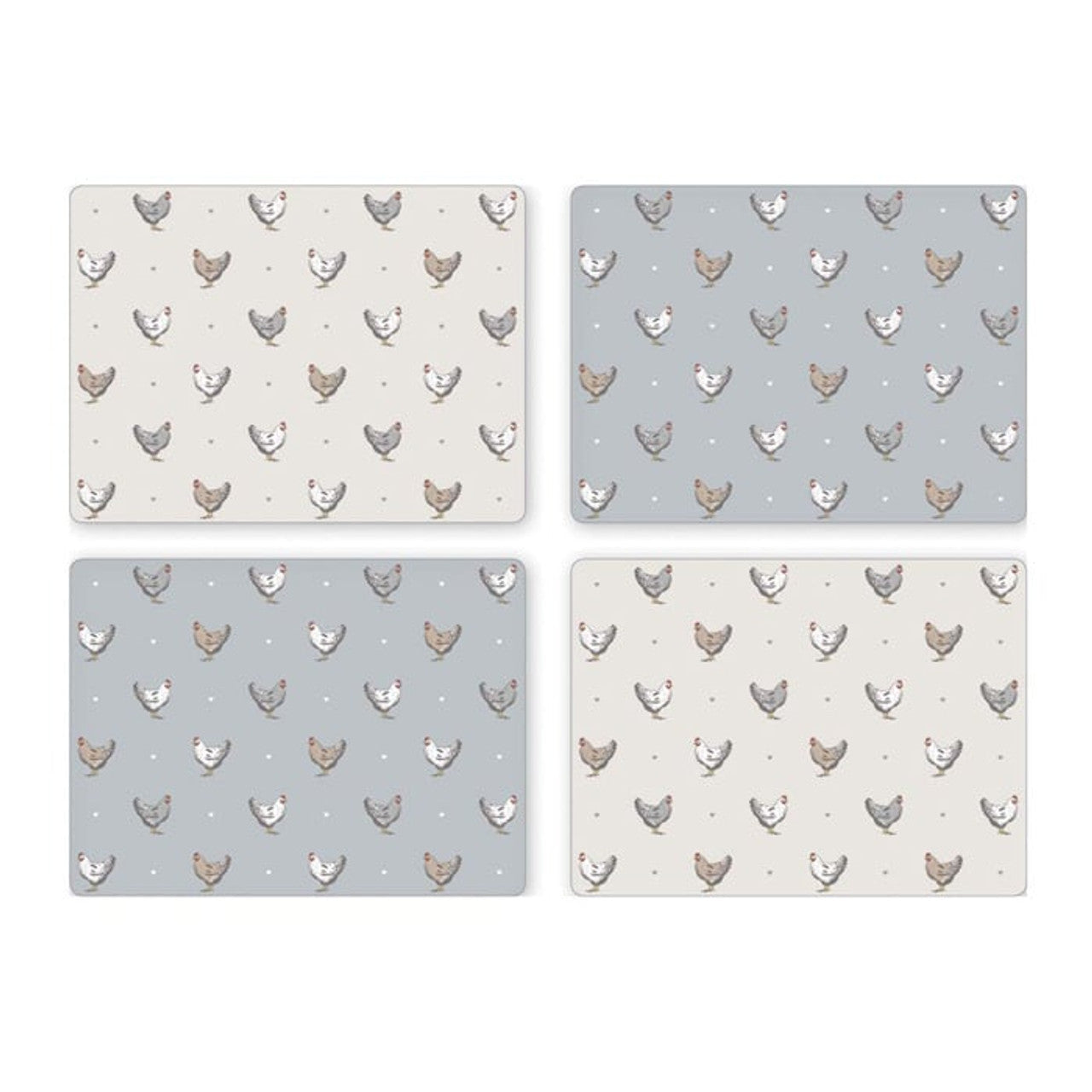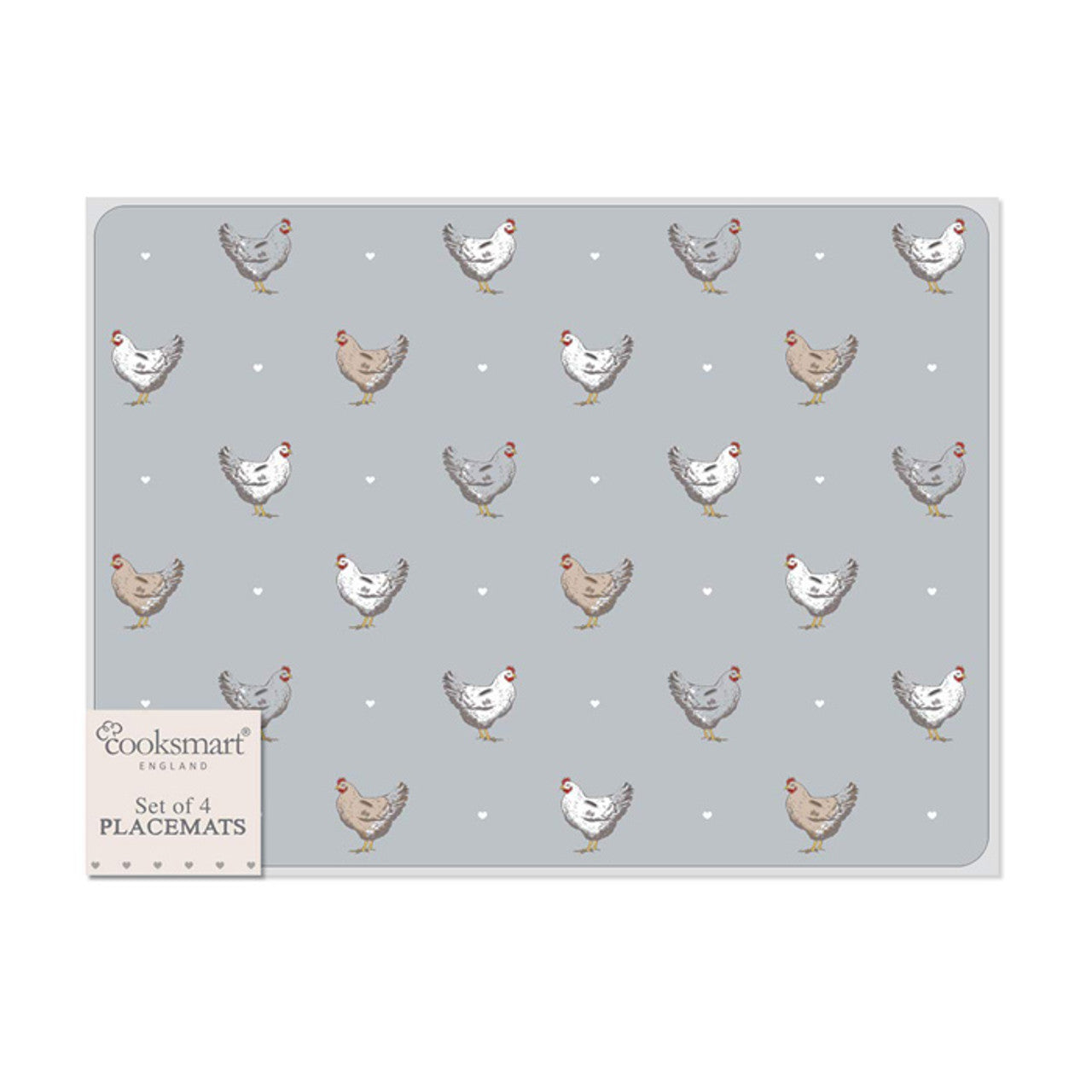 A gorgeous design from Cooksmart, to add to the dining table to protect against marks and spills. Part of the coordinating Farmers Kitchen collection, this placemat set features an all over chicken design on gorgeous chalky blue hue and cream backgrounds. With a cork base and a matte finish coating on the front these placecmats can resist temperatures of up to 90°C.