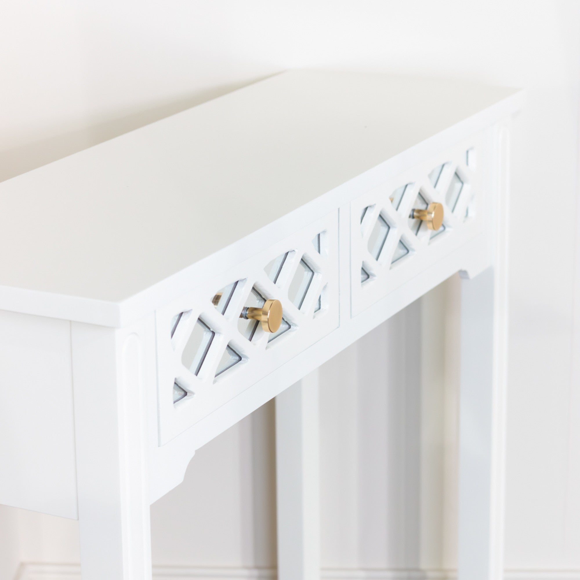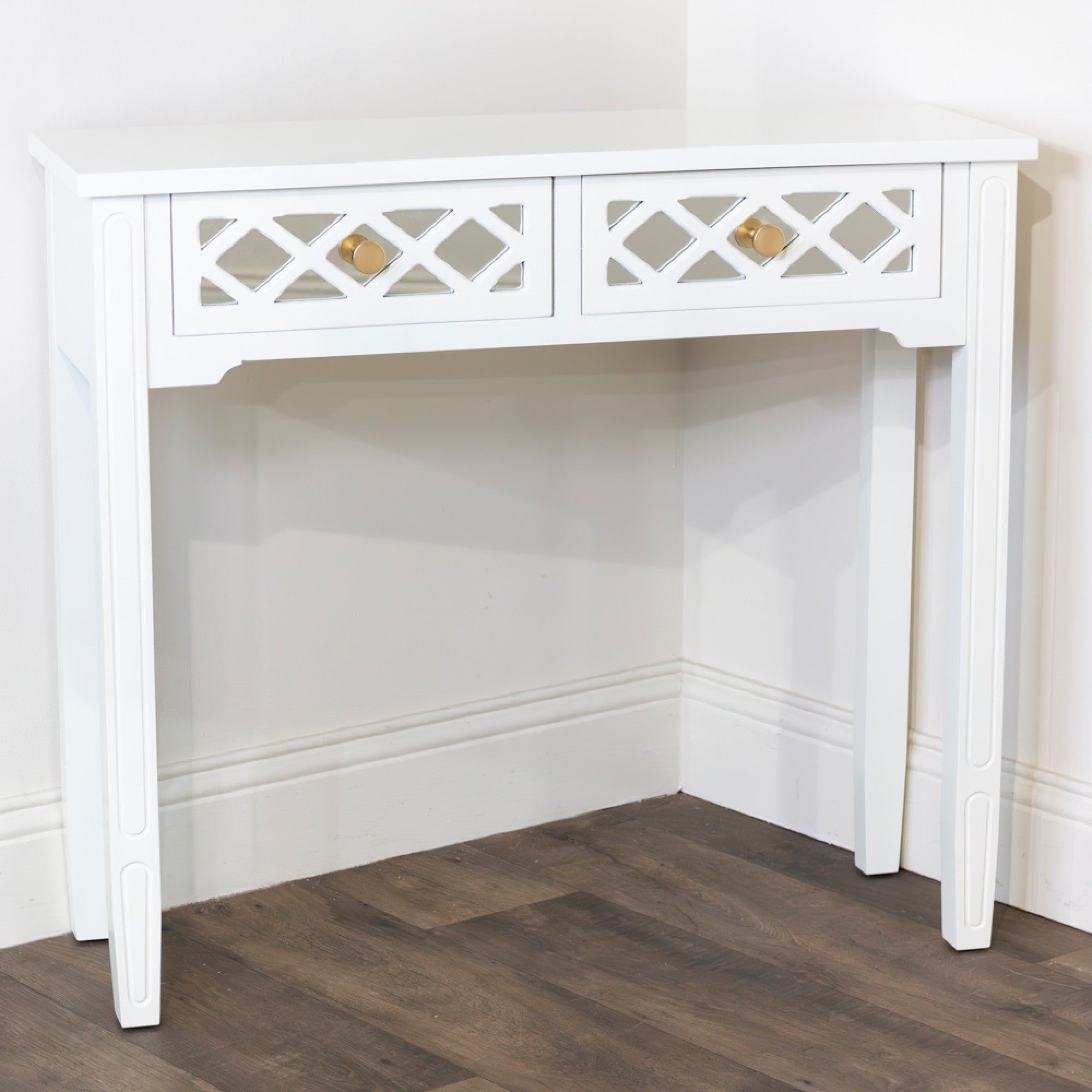 The carla 2-drawer mirrored console table in white offers elegance and functionality. with mirrored surfaces and a white finish, it adds glamour to any space. two drawers provide storage, making it perfect for entryways or living rooms.Adds glamour and reflects light