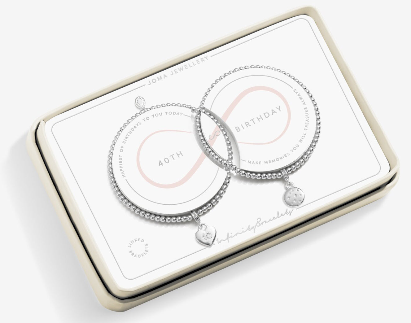 Whether you’re celebrating a twinkling 21st or a fabulous 50th, our Infinity Bracelets are sure to put the sparkle in every special birthday. Featuring two of our signature beaded bracelets, linked together and crowned with pavé-set bails and the sweetest charms to celebrate their milestone, our '40th Birthday' Linked Infinity Bracelets In Silver Plating will arrive ready to delight in one of our rounded rectangular gift boxes. Hip, hip, hooray!