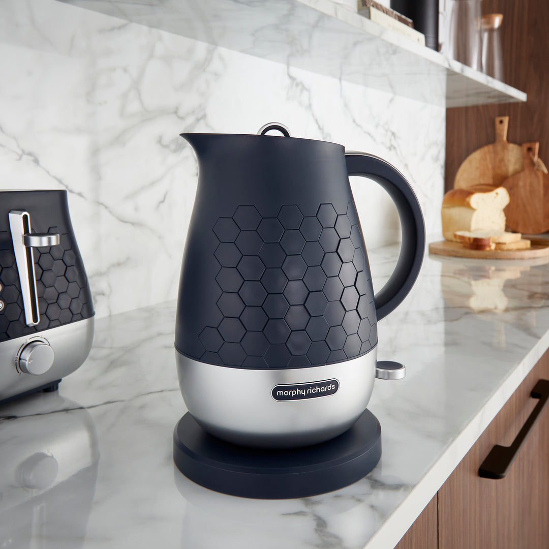 Discover the Morphy Richards Cassini 1.7L Jug Kettle! Boasting a sleek design with efficient functionality, this modern navy kettle delivers a standout choice for any kitchen. The Cassini kettle features a distinctive hexagonal design, creating a cohesive and modern aesthetic for your kitchen. The jug kettle offers a generous 1.7L capacity and powerful 3kW rapid boil element meaning this electric kettle quickly heats water for multiple cups, saving you time. The carefully designed spout ensures a smooth, splash-free pour every time, while the 360-degree base allows you to place the kettle back onto the base from any angle, perfect for left- or right-handed users!