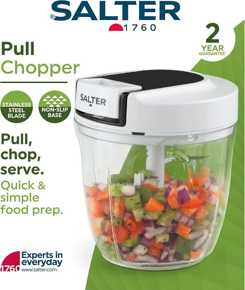 CHOPPER: This Pull Chopper by Salter quickly and easily chops, minces, and dices your fruit and vegetables for the fastest food preparation! Just pull the cord horizontally to spin the blades and achieve perfectly chopped food every time.