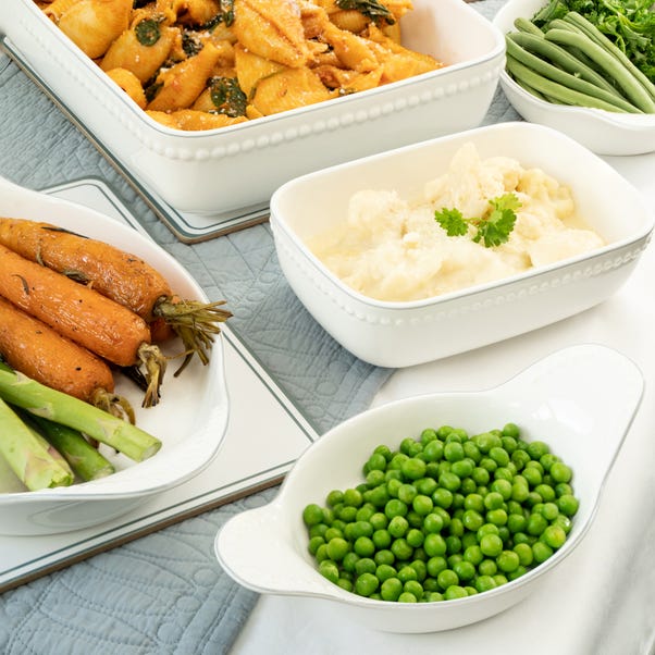 Made from fine china the Mary Berry Medium Roasting Dish with a classic, beaded border and a hint of grey adds an elegant look to your dinner table. Oven safe, this roasting dish can be used to roast, bake, and serve straight from oven to table. And this 27cm size is ideal for 2-3 perfectly sized portions of your favourite cottage pie, moussaka, or apple crumble. Designed to be hard-wearing and chip resistant, it’s safe to use in the freezer and microwave for convenience and is dishwasher safe for easy cleaning. Available in a larger 35.5cm and a smaller 19cm size, why not combine all pieces to suit all you cooking needs.