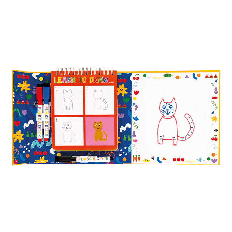 Become a budding artist with our Pets themed Learn to Draw activity. Open the book to reveal 8 thick glossy pages, 3 colour dry wipe pens with erasers and a draw and colour section to copy the image. Each page has a 3 step guide as to how to draw your masterpiece! The book folds almost flat with a magnetic closure and is perfect for travel and taking out and about. Reusable over and over again.