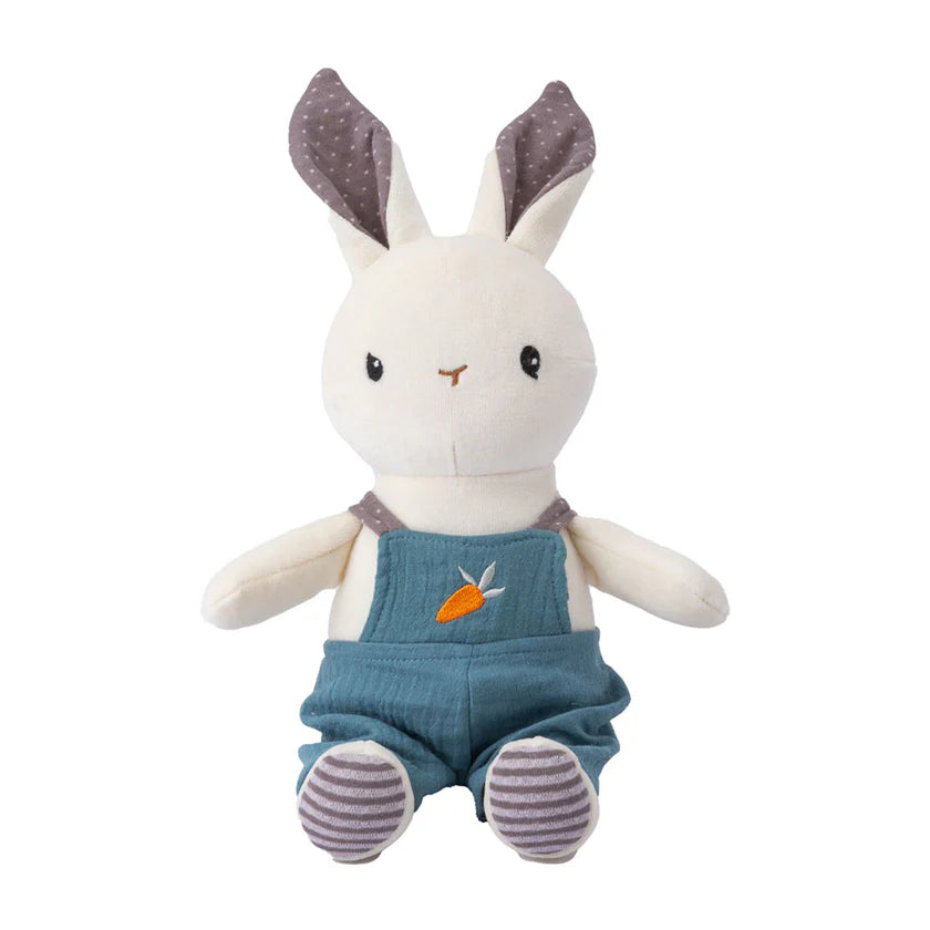 Meet our irresistibly soft and cuddly Large White Rabbit, dressed in adorable blue dungarees with carrot embroidery detail! Made from luxurious organic cotton velour, this charming bunny is perfect for snuggles, play, and bringing comfort to your little one’s world.