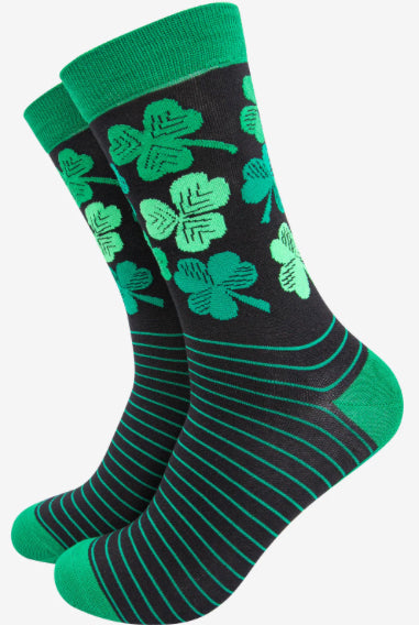 MSH Men’s Irish Shamrock and Four Leaf Clover Print Bamboo Socks in Black Green