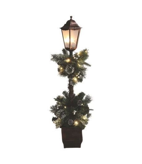 Traditional style light up lantern wrapped in frosted Christmas foliage with berries and baubles